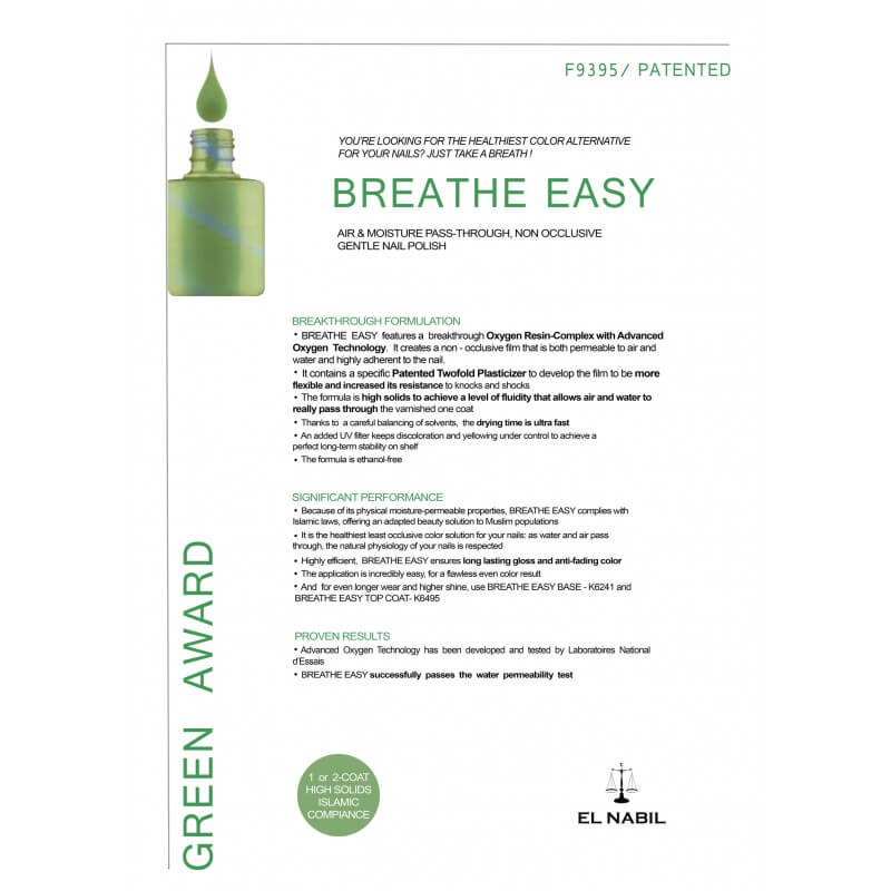 BREATHE EASY bietet einen bahnbrechenden Oxygen Resin-Complex mit Advanced Sauerstoff-Technologie an. Es entsteht ein nicht - okklusiver Film, der sowohl Luft - als auch Wasser durchlässig ist. Es enthält einen spezifischen patentierten zweifachen Weichmacher, um den Film besser zu entwickeln, es ist flexibel und erhöht seine Beständigkeit gegen Stöße und Schläge. Die Formel hat einen hohen Feststoffgehalt, um ein Fließvermögen zu erreichen, das Luft und Wasser zulässt um damit wirklich durch den lackierten Nagel zufließen. Dank eines sorgfältigen Austausches von Lösungsmitteln ist die Trocknungszeit ultraschnell. Ein hinzugefügter UV - Filter hält Verfärbungen und Vergilbungen unter Kontrolle, um eine perfekte Langzeitstabilität im Regal zu gewährleisten. Die Formel ist ethanolfrei. Aufgrund seiner physikalischen feuchtigkeitsdurchlässigen Eigenschaften entspricht BREATHE EASY den Islamischen Gesetzen, die der muslimischen Bevölkerungen eine angepasste schönheitslösung anbietet. Es ist die gesündeste Farblösung für Ihre Nägel: Wasser und Luft passieren komplett durch, die natürliche Physiologie Ihrer Nägel wird respektiert. Hoch effizient, BREATHE EASY sorgt für lang anhaltenden Glanz und Anti-Fading-Farbe. Die Anwendung ist unglaublich einfach, für ein makelloses, gleichmäßiges Farbergebnis tragen Sie maximal 2 Schichten Nagellack auf. Advanced Oxygen Technology wurde von Laboratoires National d'Essais entwickelt und getestet.